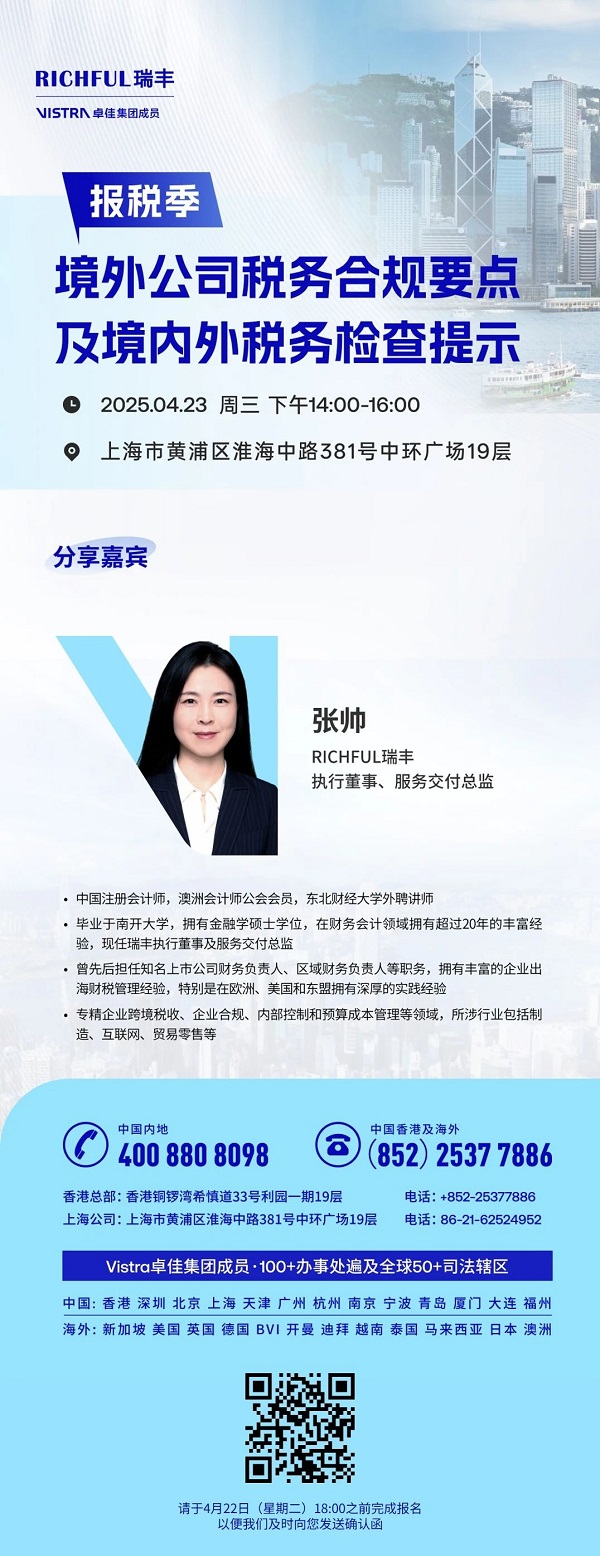 邀請函 | 4月23日 上海|報稅季——境外公司稅務合規(guī)要點及境內外稅務檢查提示