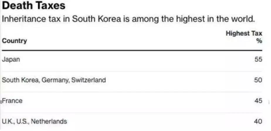 根據(jù)安永會(huì)計(jì)師事務(wù)所出具的報(bào)告,韓國的遺產(chǎn)稅排在世界前列,最高繳納稅率要高于法國的45%,英國、美國的40%,與德國、瑞士持平。