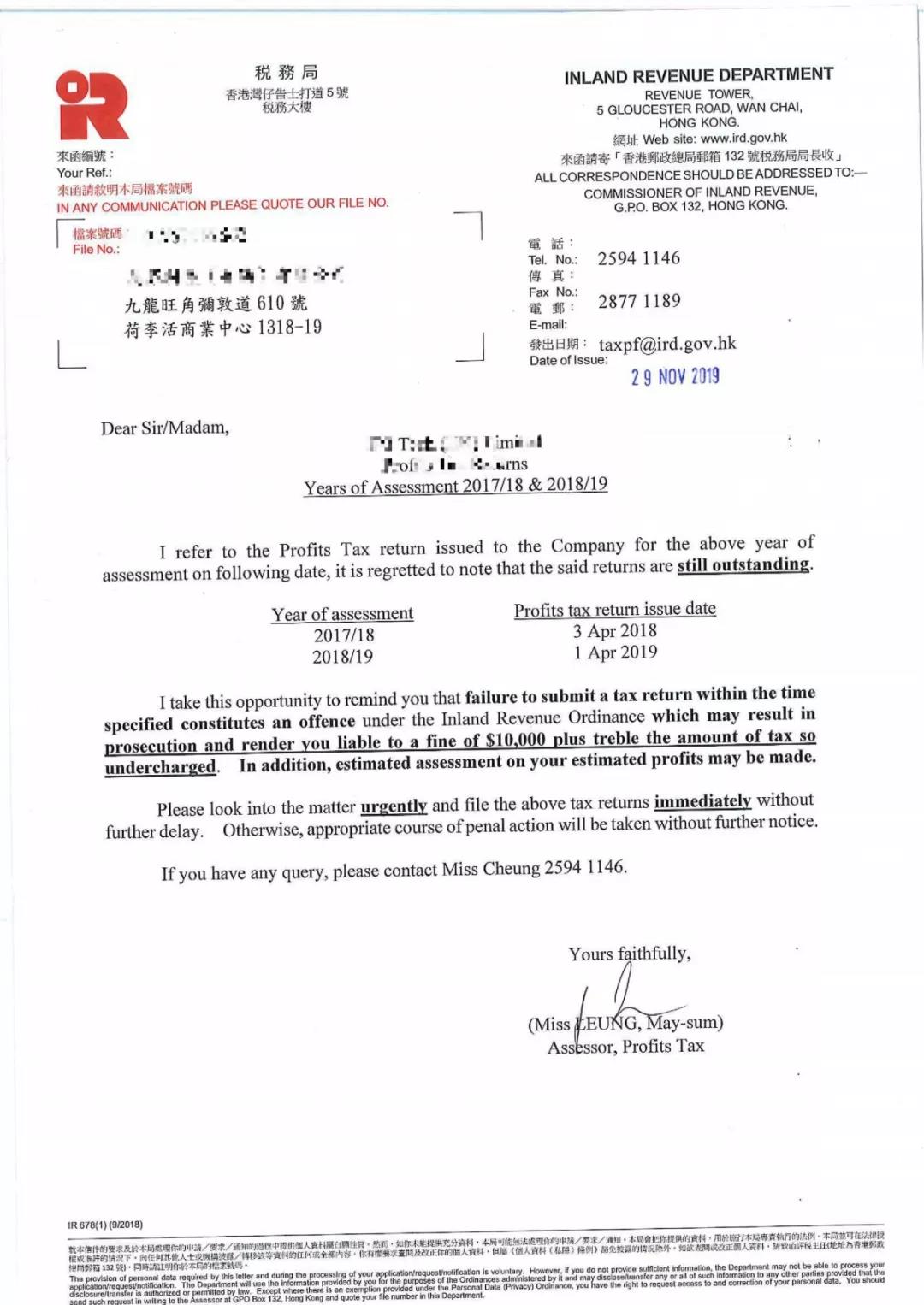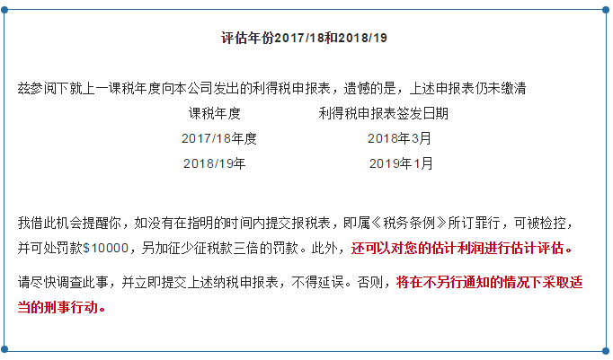 同時(shí),截止12月尚未申報(bào)的公司,香港稅局也陸續(xù)開始下發(fā)通牒信函(如圖所示),公司將可能面臨高額罰款及評(píng)稅,且進(jìn)行強(qiáng)制扣稅!