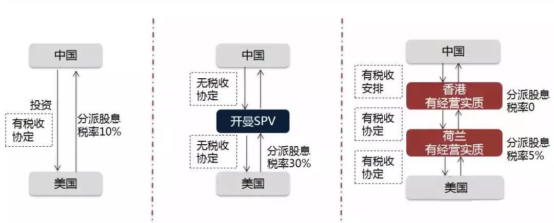 美國(guó)對(duì)沒(méi)有簽訂雙邊稅收協(xié)定的國(guó)家征收30%股息稅,因此,通過(guò)離岸公司非但不能節(jié)省稅收,更適得其反,承擔(dān)更高的稅負(fù)。只有充分考慮了投資目標(biāo)國(guó)內(nèi)法、雙邊及多邊協(xié)議及條約、及特殊地域優(yōu)惠后做出的投資架構(gòu)才是適合的。