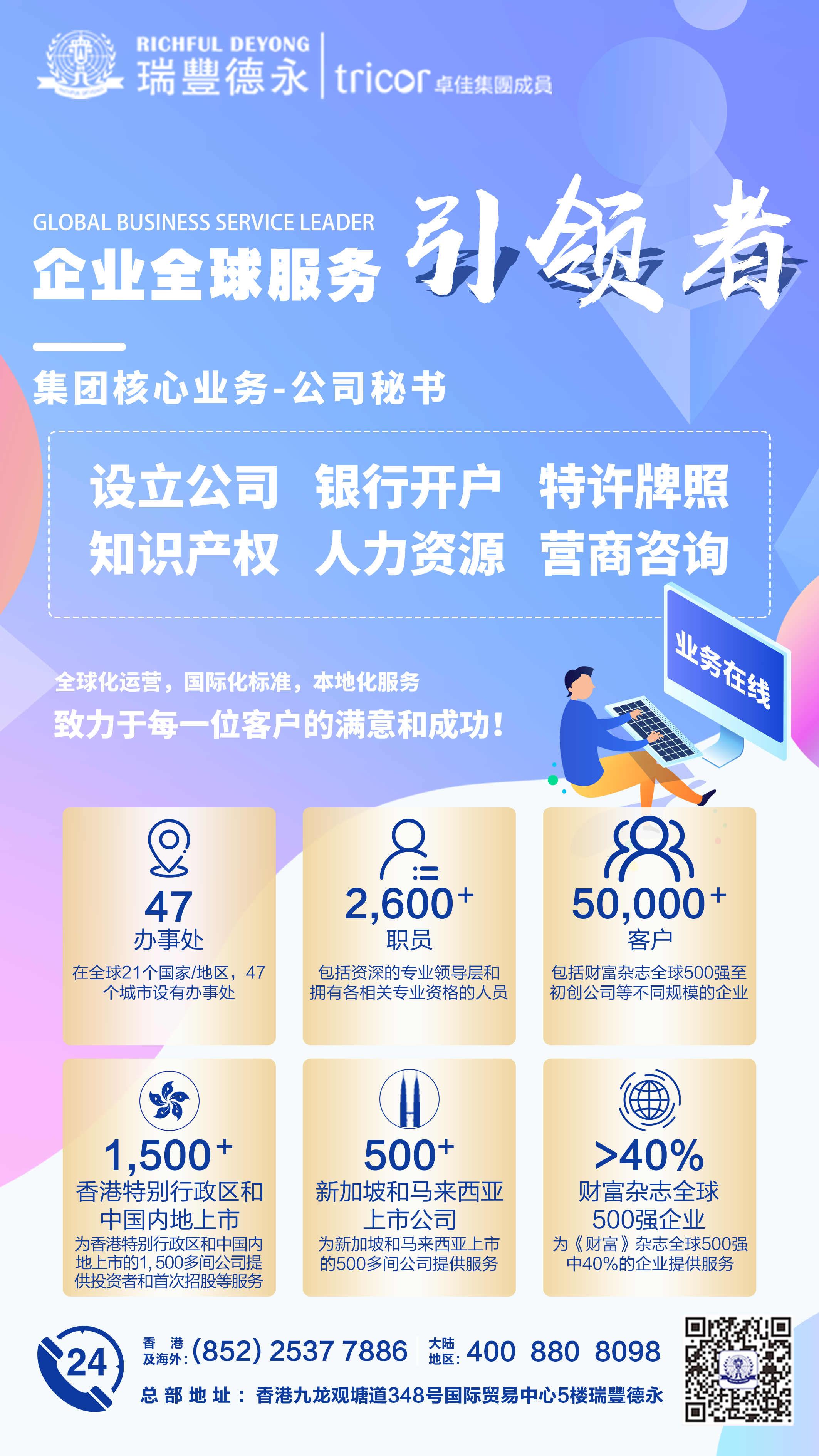 香港公司的秘書服務(wù)公司不僅是法定存在,而且在香港的運(yùn)營和維護(hù)中也起著重要作用。作為公司與政府之間的紐帶,秘書服務(wù)公司可以及時(shí)處理政府的函件和相關(guān)事件,并可以處理香港公司的年檢,換領(lǐng)商業(yè)登記證,制作年度報(bào)告。報(bào)告并提交,代繳各項(xiàng)政府登記費(fèi)等費(fèi)用。
