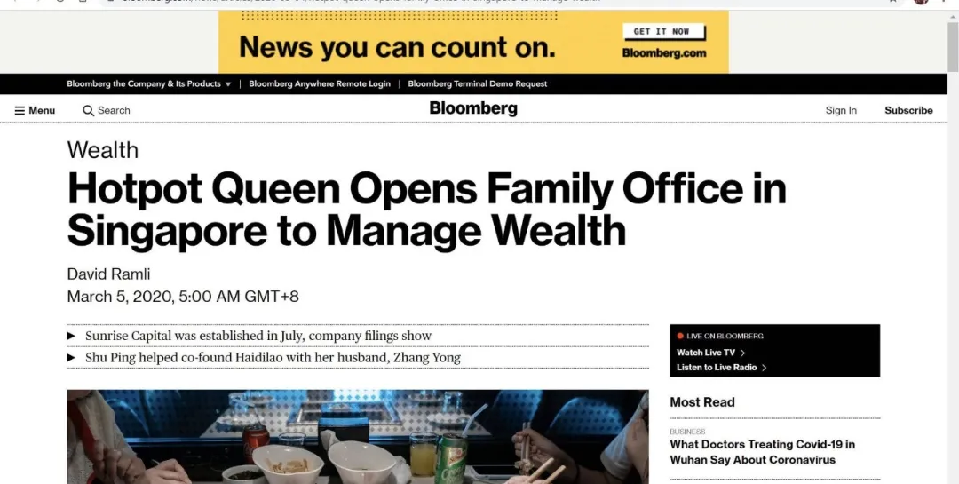 2020年3月5日彭博社Bloomberg在財富專欄的一篇報導(dǎo)《火鍋女王在新加坡設(shè)立家族辦公室以管理財富》,迅速將全球最大的火鍋連鎖店海底撈送上了熱搜。