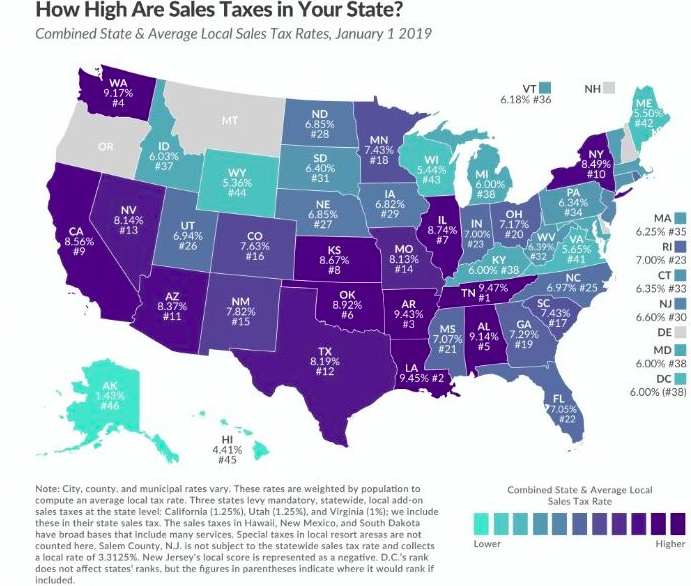 銷售稅率最高的五個(gè)州是路易斯安那州(9.98%),田納西州(9.46%),阿肯色州(9.30%),阿拉巴馬州(9.01%)和華盛頓州(8.92%)。