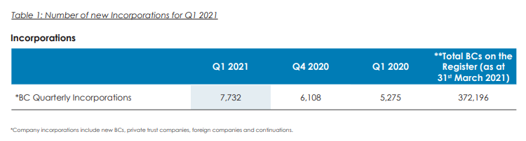 7月13日,香港公司注冊(cè)處發(fā)表2021年上半年統(tǒng)計(jì)數(shù)字,統(tǒng)計(jì)數(shù)字顯示,截至今年六月底,根據(jù)《公司條例》注冊(cè)的本地公司總數(shù)達(dá)1,384,504間。在2021年上半年新成立的本地公司總數(shù)為56,253間,較2020年下半年的數(shù)字上升11.07%。