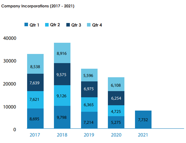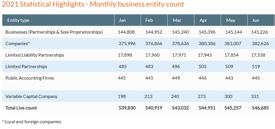 根據(jù)新加坡會(huì)計(jì)與企業(yè)管理局(ACRA) 于2021年7月1日發(fā)布的統(tǒng)計(jì)數(shù)據(jù),新加坡上半年的新設(shè)公司總數(shù)為33,349家。得益于全球經(jīng)濟(jì)復(fù)蘇,新加坡的新設(shè)公司同樣有所回暖,但是無(wú)論是現(xiàn)有公司數(shù)量、上半年新增公司數(shù)量,還是6月新增公司數(shù)量,其與香港公司的表現(xiàn)都仍有一定差距。