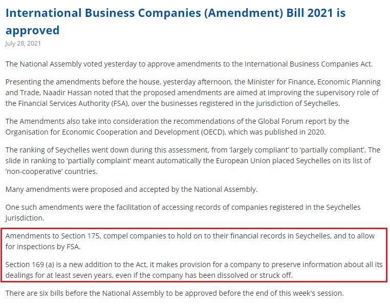 塞舌爾《2021年國際商業(yè)公司(修訂)法》更新