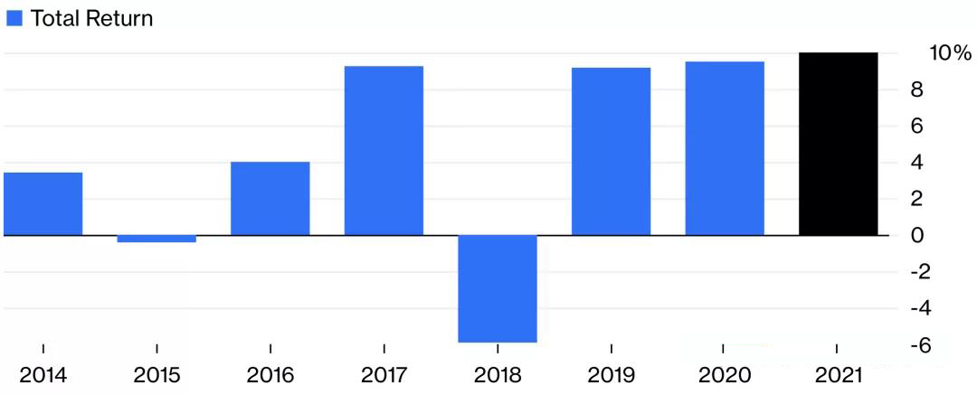 根據(jù)彭博的一份統(tǒng)計(jì)顯示,對(duì)沖基金連續(xù)三年上漲超過(guò)9% ,2021年10.3%的收益率是自2014年以來(lái)最高的。