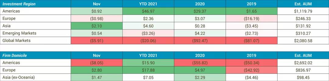 據(jù)納斯達(dá)克(Nasdaq)旗下的投資數(shù)據(jù)分析公司eVestment數(shù)據(jù),截止2021年11月,亞洲對(duì)沖基金行業(yè)總資產(chǎn)(AUM)約為1,319.2億美元,較美洲的11,197.9億美元還有很大的差距。但2021年前11個(gè)月,該區(qū)不論是投資流量還是管理公司資產(chǎn)管理規(guī)模,都遠(yuǎn)超去年全年。