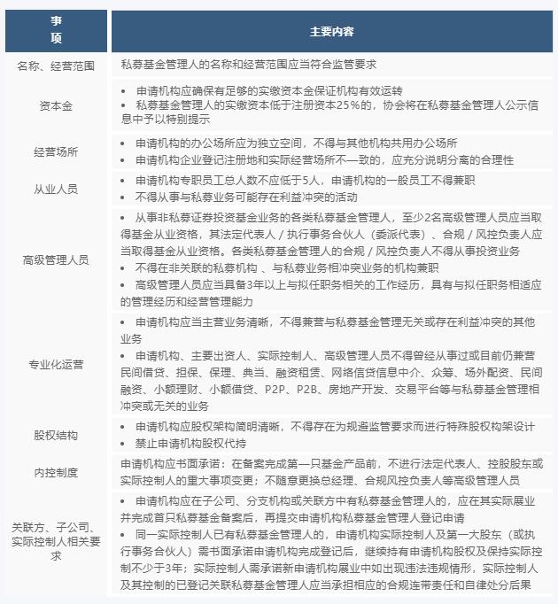 基金業(yè)協(xié)會發(fā)布的《私募投資基金管理人登記和基金備案辦法 (試行)》、《關于進—步規(guī)范私募基金管理人登記若干事項的公告》、《私募基金管理人登記須知》、《私募基金登記備案相關問題解答》、《關于私募基金管理人登記備案工作相關事宜的通知》等規(guī)定對私募基金管理人的登記要求做出了具體的規(guī)定,主要要點包括: