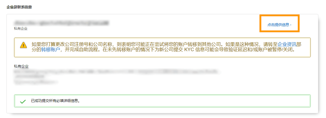 ② 單擊法人實體名稱旁邊的“點擊提供信息”,以便您可以更新法定企業(yè)名稱;