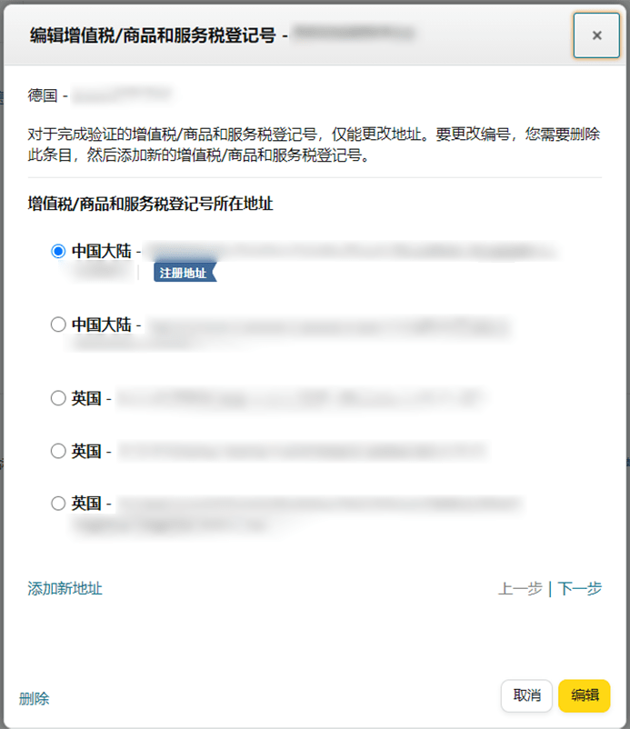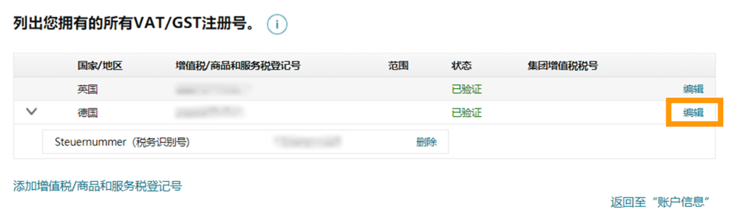 ② 單擊關聯(lián)的增值稅稅號旁邊的“編輯”按鈕;