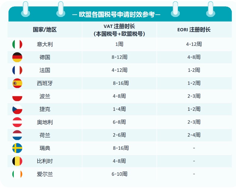 答:歐盟各國(guó)增值稅稅號(hào)注冊(cè)時(shí)長(zhǎng)不一(請(qǐng)見(jiàn)下方“歐盟各國(guó)稅號(hào)申請(qǐng)時(shí)效參考”)