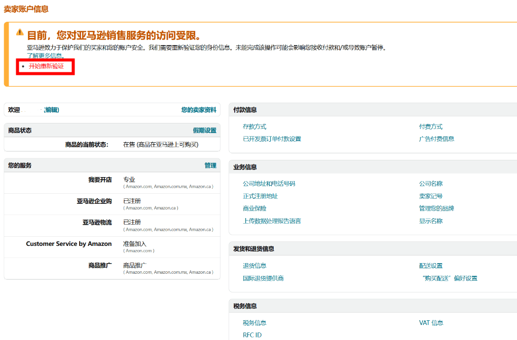 ②若驗證失敗,賣家可以在同一位置點擊“開始重新驗證”來重新啟動驗證過程。如果在法規(guī)生效后還未能成功完成驗證,賣家對亞馬遜銷售服務(wù)的訪問將受到限制。
