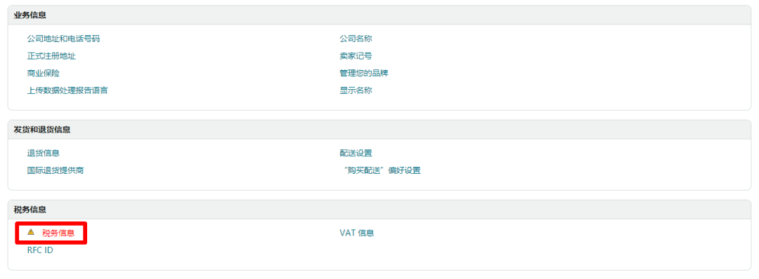 2、登錄亞馬遜賣家平臺,點擊“設(shè)置 > 賬戶信息 > 稅務(wù)信息 > 稅務(wù)信息”,找到驗證入口。