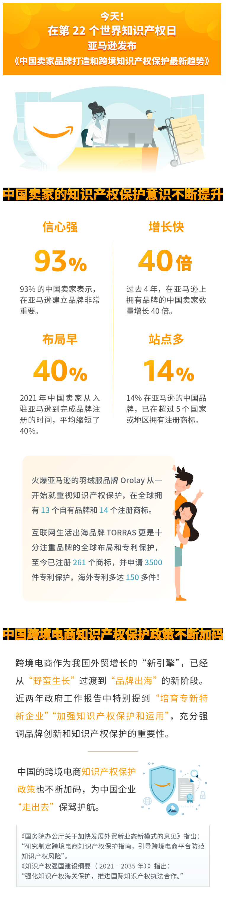 隨著經(jīng)濟(jì)的發(fā)展,跨境電商賣家對(duì)知識(shí)產(chǎn)權(quán)、對(duì)品牌日漸重視,在第22個(gè)世界知識(shí)產(chǎn)權(quán)日亞馬遜發(fā)布了《中國(guó)賣家品牌打造和跨境知識(shí)產(chǎn)權(quán)保護(hù)最新趨勢(shì)》。