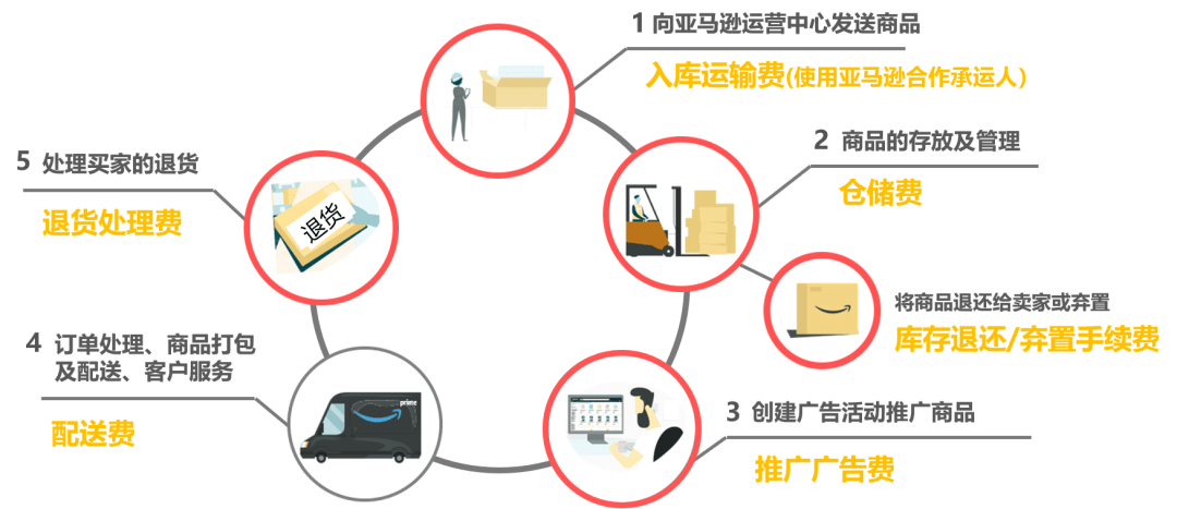 FBA的主要費(fèi)用包括:入庫運(yùn)輸費(fèi)、倉儲費(fèi)、庫存移除費(fèi)、配送費(fèi)、退貨處理費(fèi)等,如下圖所示。