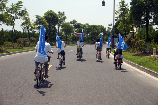 上午9:40活動正式開始,我們從東錢湖游客中心出發(fā),每輛車后面都打出了統(tǒng)一旗幟,展示環(huán)保口號,吸引了不少路人的駐足觀看。