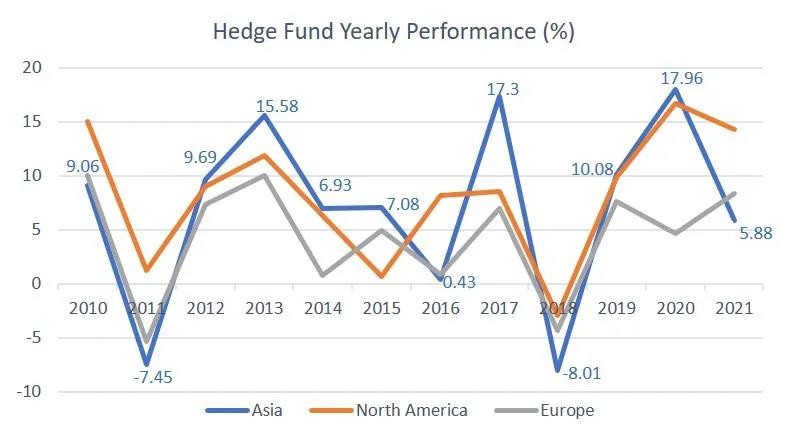 據(jù)對(duì)沖基金研究機(jī)構(gòu)Eurekahedge,2021年亞洲對(duì)沖基金收益率為5.88%,低于2020年的水平。回顧過(guò)去12年,多數(shù)年份對(duì)沖基金在亞洲的表現(xiàn)都優(yōu)于北美與歐洲。