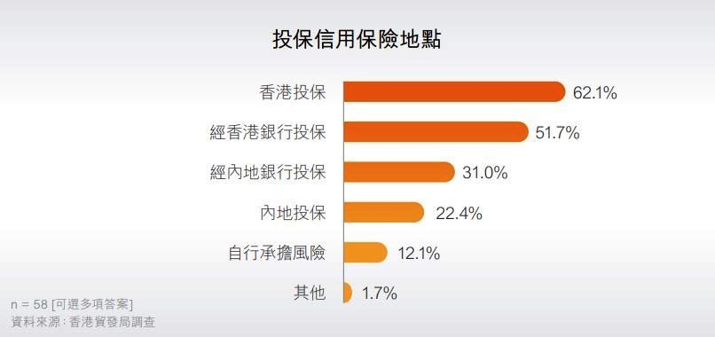在有投保信用保險(xiǎn)的企業(yè)當(dāng)中,不少企業(yè)通過兩個(gè)或以上地點(diǎn)投保。當(dāng)中,大部分企業(yè)通過香港直接投保(62.1%),51.7%則經(jīng)香港銀行投保,也有31.0%經(jīng)內(nèi)地銀行投保、22.4%直接在內(nèi)地投保等,也有少數(shù)表示會(huì)到海外投保(其他:1.7%)。