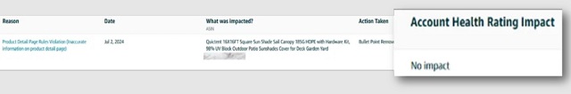 • 每次違反同一政策,您的賬戶狀況評級中與該違反政策行為相關(guān)的分值都會增加。這意味著,反復(fù)違規(guī)會導(dǎo)致您的賬戶狀況評級更快地被降級,反復(fù)出現(xiàn)嚴(yán)重程度更高的違反政策行為影響更大。為了幫助您識別和跟蹤重復(fù)違規(guī)行為,以更快、更系統(tǒng)地解決問題,重復(fù)違規(guī)行為會在您的賬戶狀況頁面的“影響”欄中被標(biāo)記。